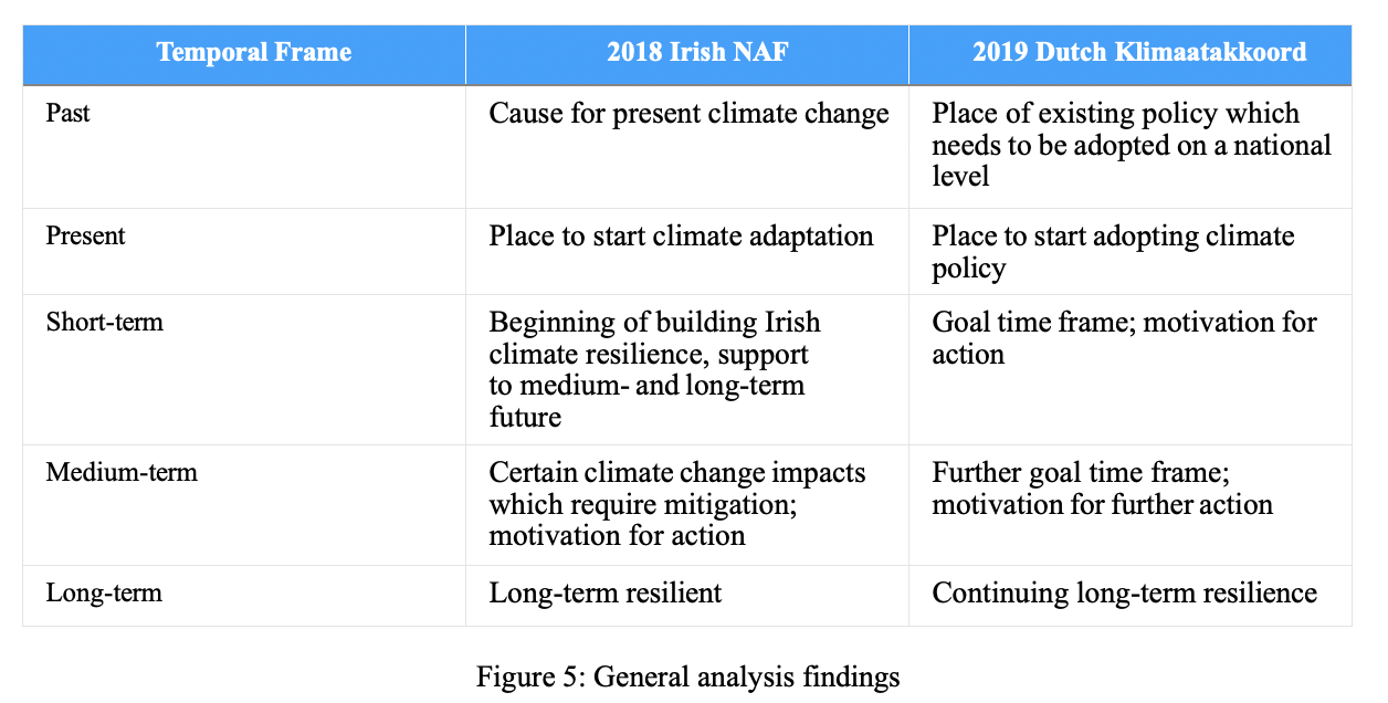 In conclusion, this research paper aimed to answer the research question “How did Ireland and the Netherlands temporally frame the climate crisis in comparison after the Paris Agreement?”. It investigated the way climate change and its temporality were framed in the 2018 Irish National Adaptation Framework (NAF) and the 2019 Dutch Klimaatakkoord (KA) through a frame analysis. Based on the findings expanded upon in the previous chapter, the following conclusions can be made.