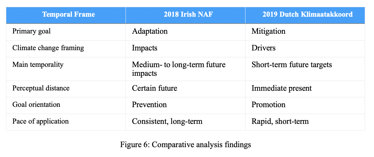 Ireland and the Netherlands framed climate change very differently in 2018-2019. Ireland framed the impacts of climate change as the main challenge, the Netherlands instead posed its drivers as the problem. In terms of temporality, Ireland saw climate change as an issue of the medium- to long-term future, while the Netherlands posed it as a short-term future problem. These temporal frames affected how and with what tempo the two countries proposed to tackle the challenge, as well as what deadlines they connected to the proposed policy, which shows how framing guides decision-making on climate change (De Boer et al., 2010).